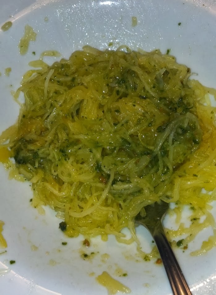 First I baked it and then added Chimi Churi sauce that I also purchased @ the farmer's market. YUM! You can use Spaghetti Squash just as you would spaghetti noodles. I LOVE it with Pesto!