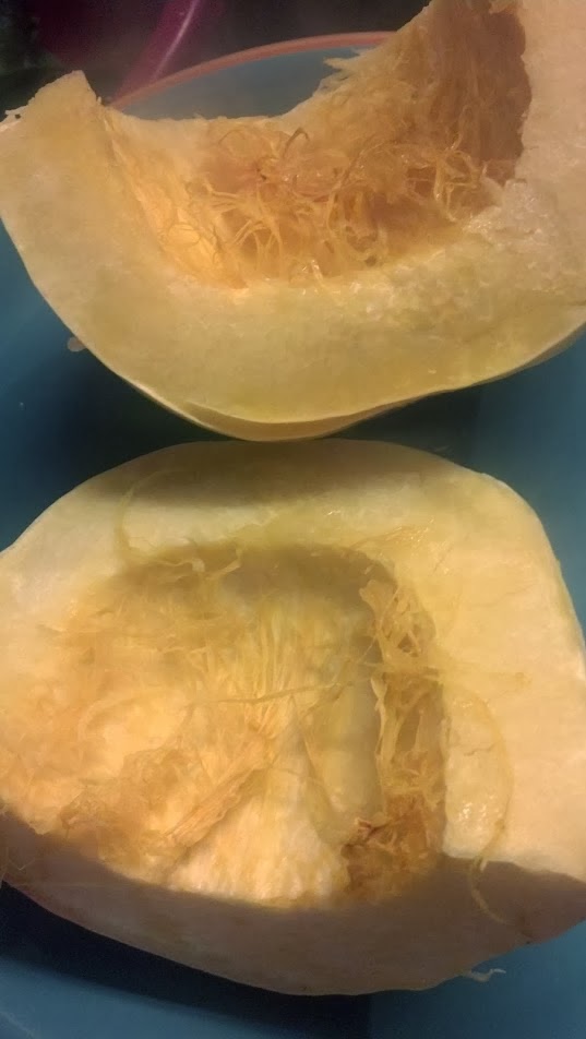 When the squash is cooked it comes off the rind with a fork and looks like spaghetti noodles!