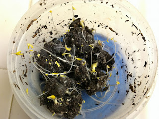 To make it easy for them to transport, we stapled the instructions to small bags for them to take home. A cardboard box would be better to store them in but that wasn't possible this time around. Funny thing happened to my seed balls. I forgot to take my "sample" seed balls out of my go-bag from the event. About 5 days later I opened it up to prep for my next school volunteer day and the seeds had SPROUTED!!