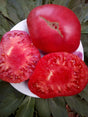 The plants of 'Marianna's Peace' have potato leaf foliage producing fruit that are a deep, reddish-pink color, weigh one pound on average, and deliver a good, balanced, sweet-acid flavor.
