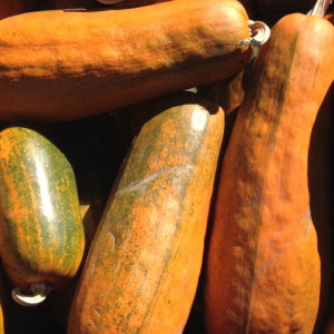 3–5 lb fruits look like overgrown thick zucchinis to the uninitiated, but the telltale sign is an orange spot where the otherwise all-green elongated fruit rested on the ground. After ripening in storage, the whole fruit first blushes, then glows bright orange, signaling that its delicious smooth flesh is ready to be turned into incomparable pies.